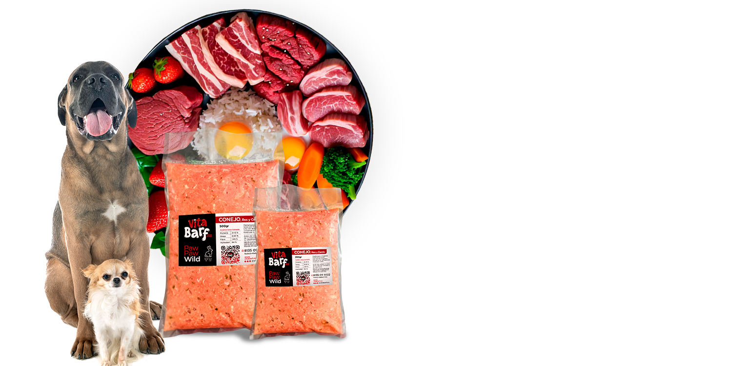 Alimento BARF hecho de Conejo, Res y Cerdo para perros alérgicos al pollo.